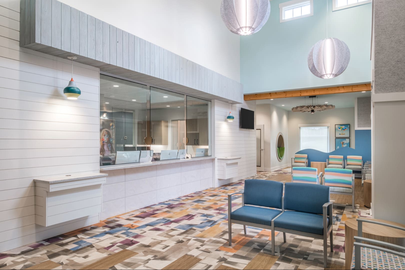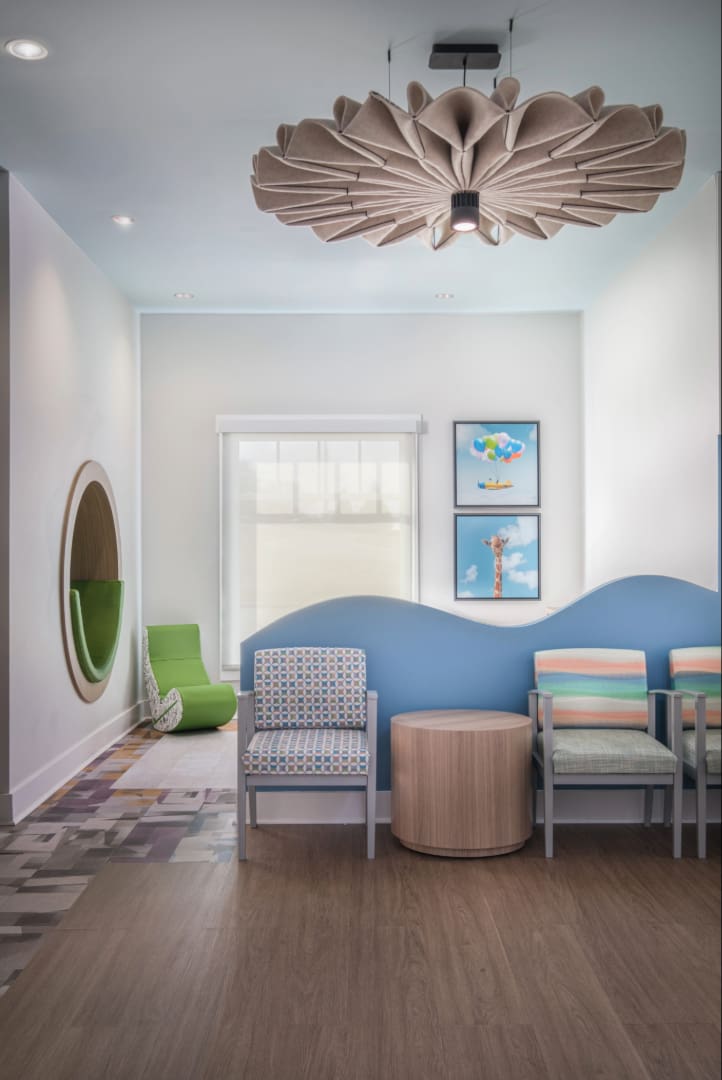 In the double-height waiting area, we tackled sound control with sound-absorbing wall coverings and large, whimsical light fixtures. Our client also desired a dedicated play space in the waiting room, which we achieved with an undulating blue wave as a partition and a cozy, round reading nook, both designed to captivate young imaginations.