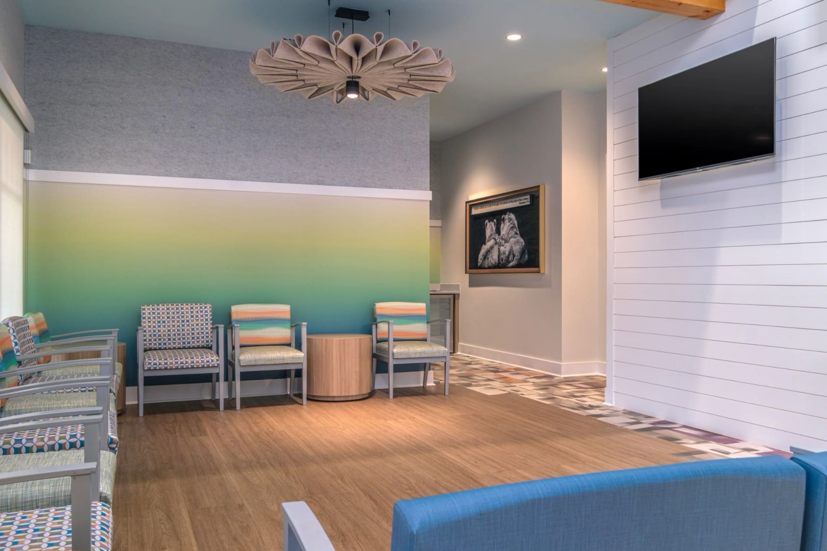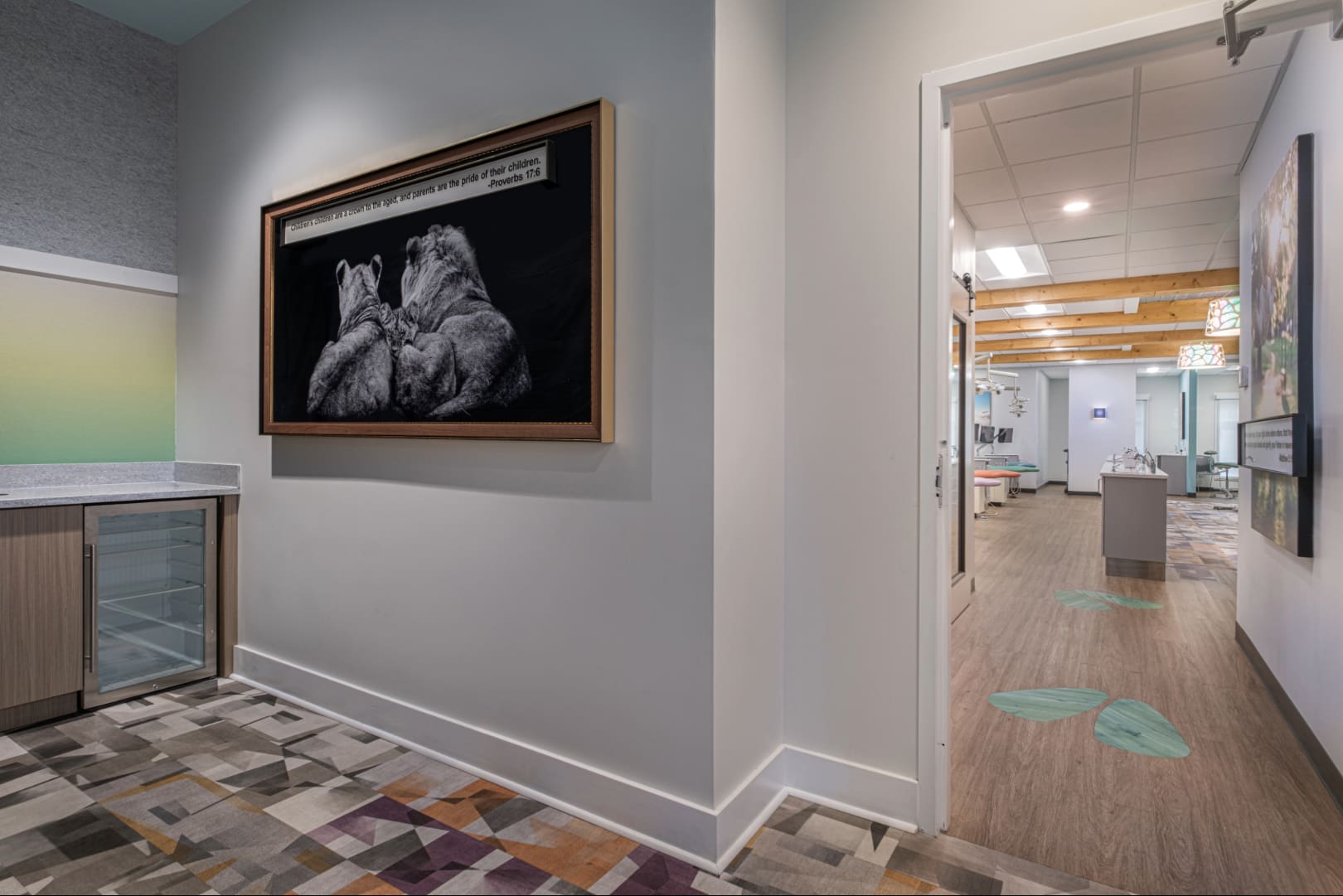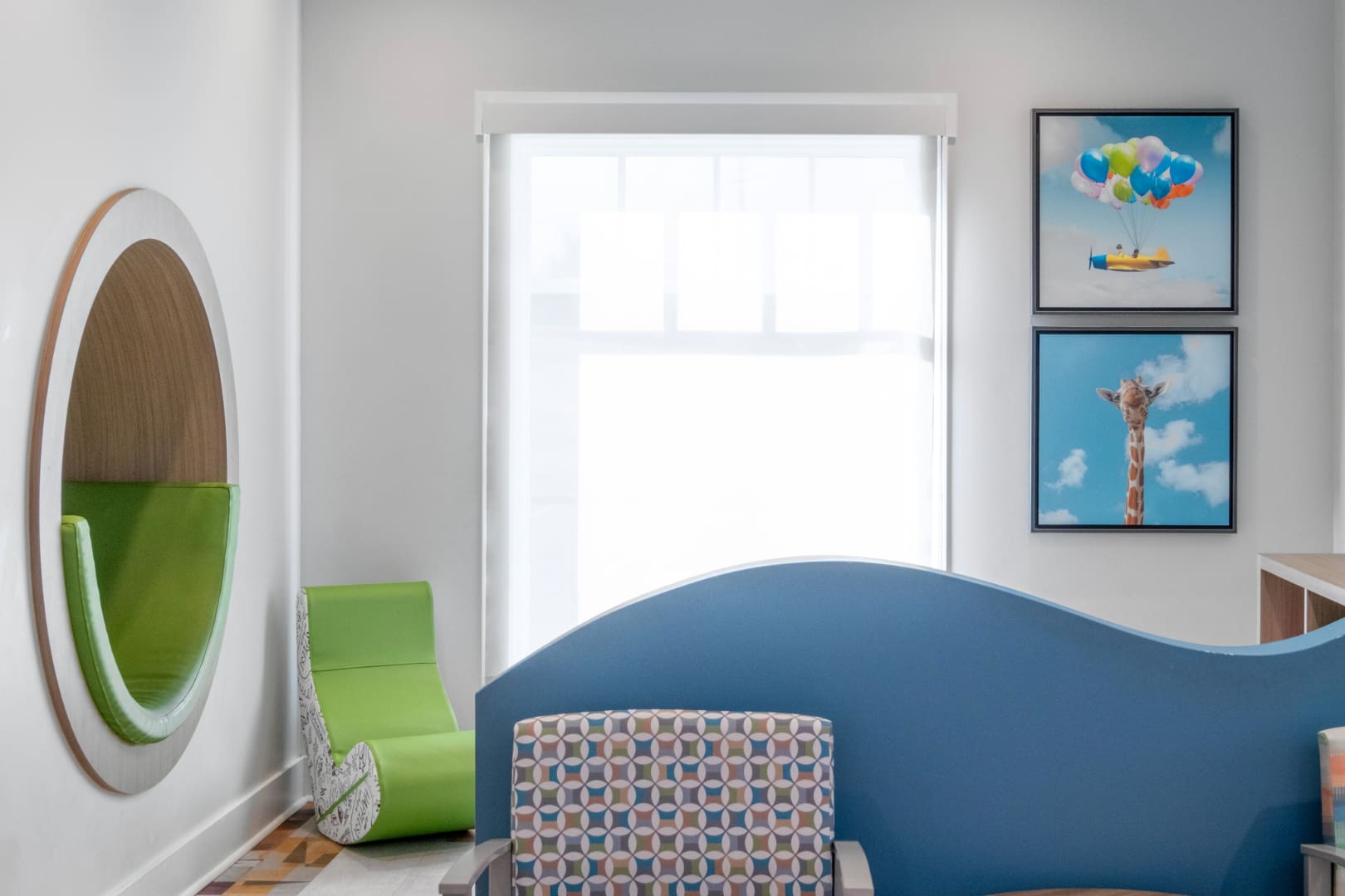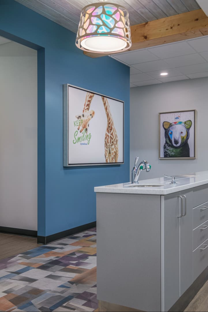 Our client wanted an environment that was fun for kids, not fearful. She envisioned fun patterns, bold colors, and interesting design features on the floor and ceiling. Most importantly, she wanted to share her faith with her patients and their families. We achieved this goal by combining her favorite Bible verses with powerful images for her art collection. The client wanted to use her giraffe logo as part of the design. We displayed giraffe imagery through patterned light fixtures, art, and hoof prints cut into the vinyl flooring to guide patients. The floor plan arranged the patient treatment areas around the perimeter. Employee workspaces placed in the center ensured optimal traffic flow and generous natural light for the patients. This design feature satisfied the client’s request for optimal functionality and safety for the children with clear sightlines to the Treatment Bay, Sub-waiting, and Sedation room.
