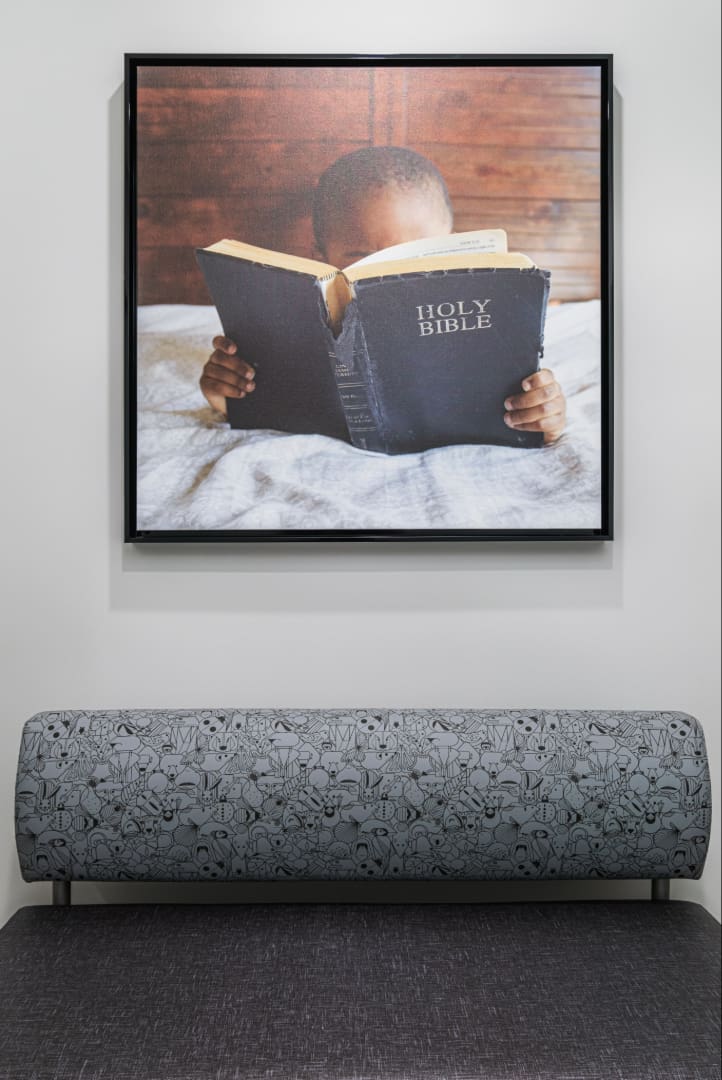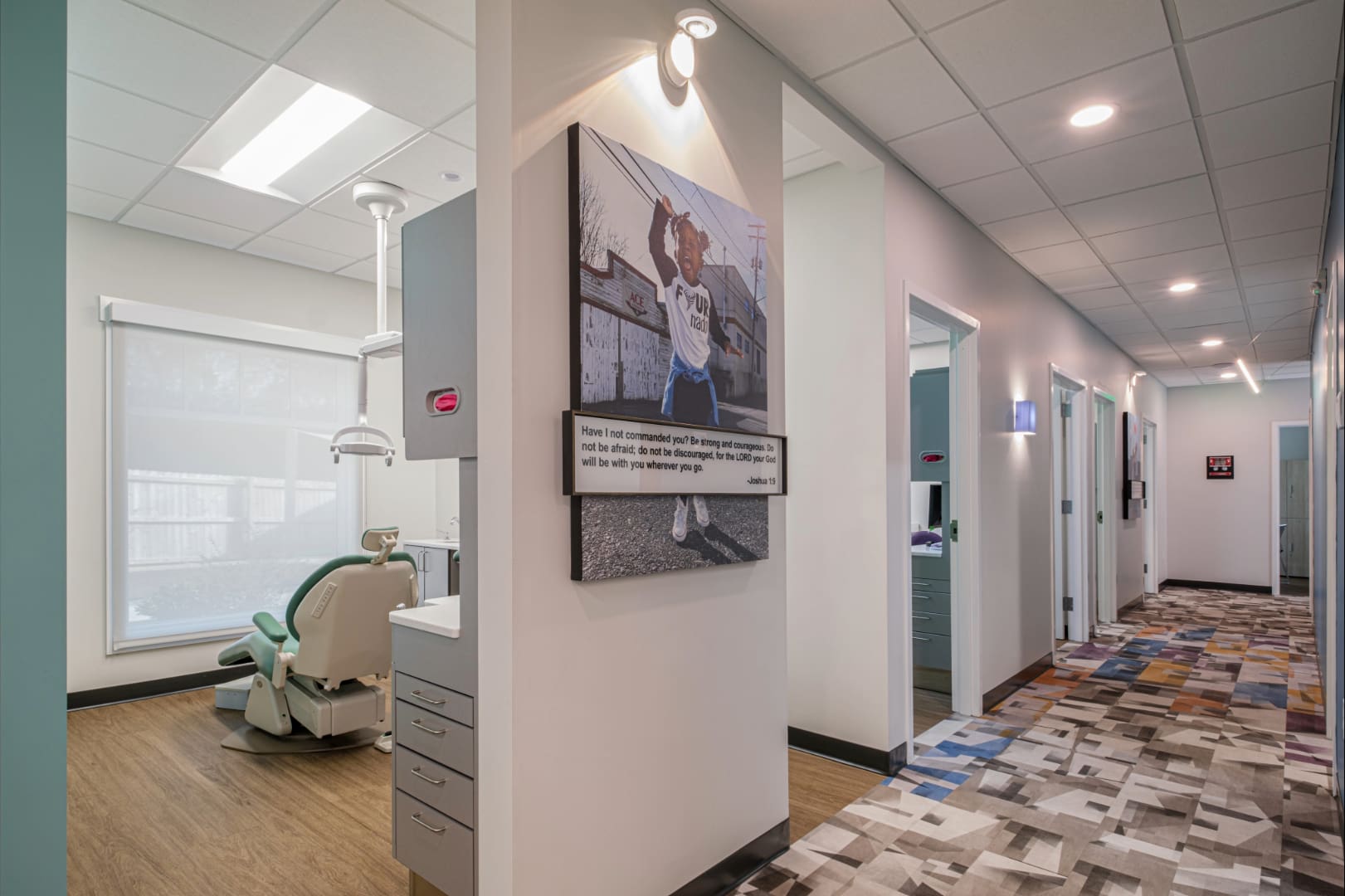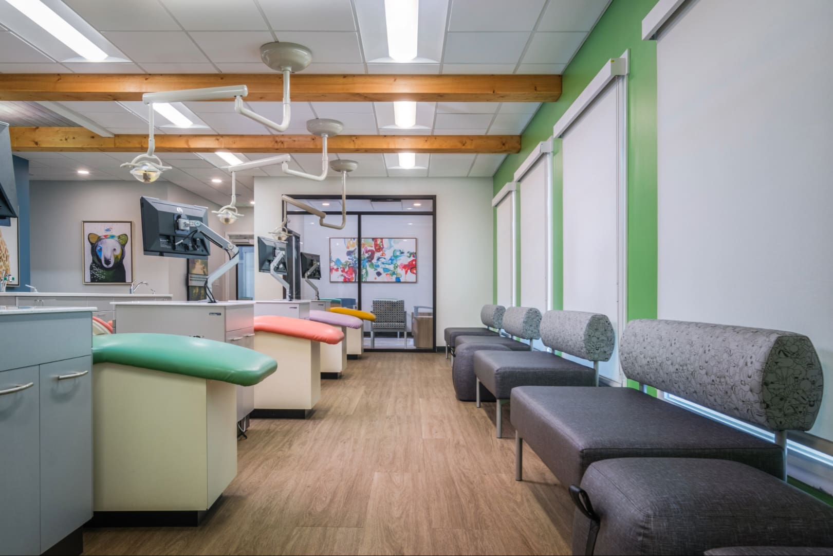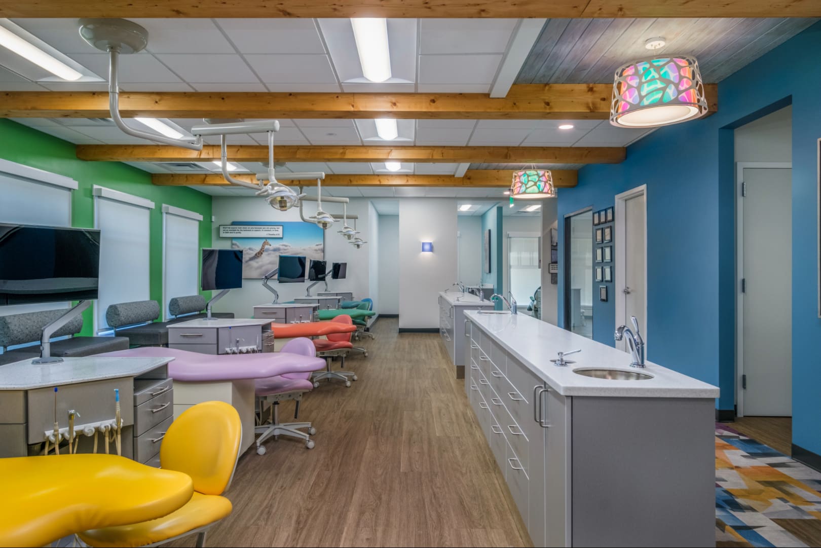 Our client wanted an environment that was fun for kids, not fearful. She envisioned fun patterns, bold colors, and interesting design features on the floor and ceiling. Most importantly, she wanted to share her faith with her patients and their families. We achieved this goal by combining her favorite Bible verses with powerful images for her art collection. The client wanted to use her giraffe logo as part of the design. We displayed giraffe imagery through patterned light fixtures, art, and hoof prints cut into the vinyl flooring to guide patients. The floor plan arranged the patient treatment areas around the perimeter. Employee workspaces placed in the center ensured optimal traffic flow and generous natural light for the patients. This design feature satisfied the client’s request for optimal functionality and safety for the children with clear sightlines to the Treatment Bay, Sub-waiting, and Sedation room.